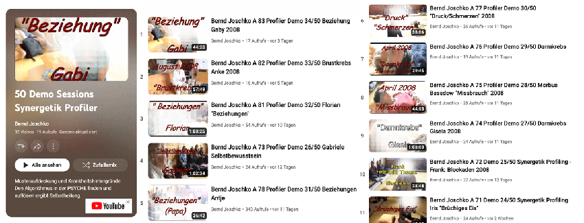 Echte Heilung ist immer Selbstheilung. Eine Methode kann nur dabei helfen. Daher kann niemand heilen - die Schulmedizin schon mal garnicht. Sie bekämpft nur die Symptome. Wer weiß schon im Einzelfall, ob die Chemo beim Überleben oder Sterben geholfen hat. Jeder muß sich selbst heilen, denn sein Leben hat ihn krank gemacht. Also gilt es als erstes herauszufinden, was im Hintergrund arbeitet - im Gedächtnisspeicher PSYCHE. Dazu wurde der Synergetik Profiler schon 2001 von Bernd Joschko entwickelt. Er deckt präzise auf. Die nebenstehende Playlist von Youtube startete vor 10 Jahren und zeigt 80 Beispiele. Die Videos wurden ca. 250.000 mal angeklickt. |